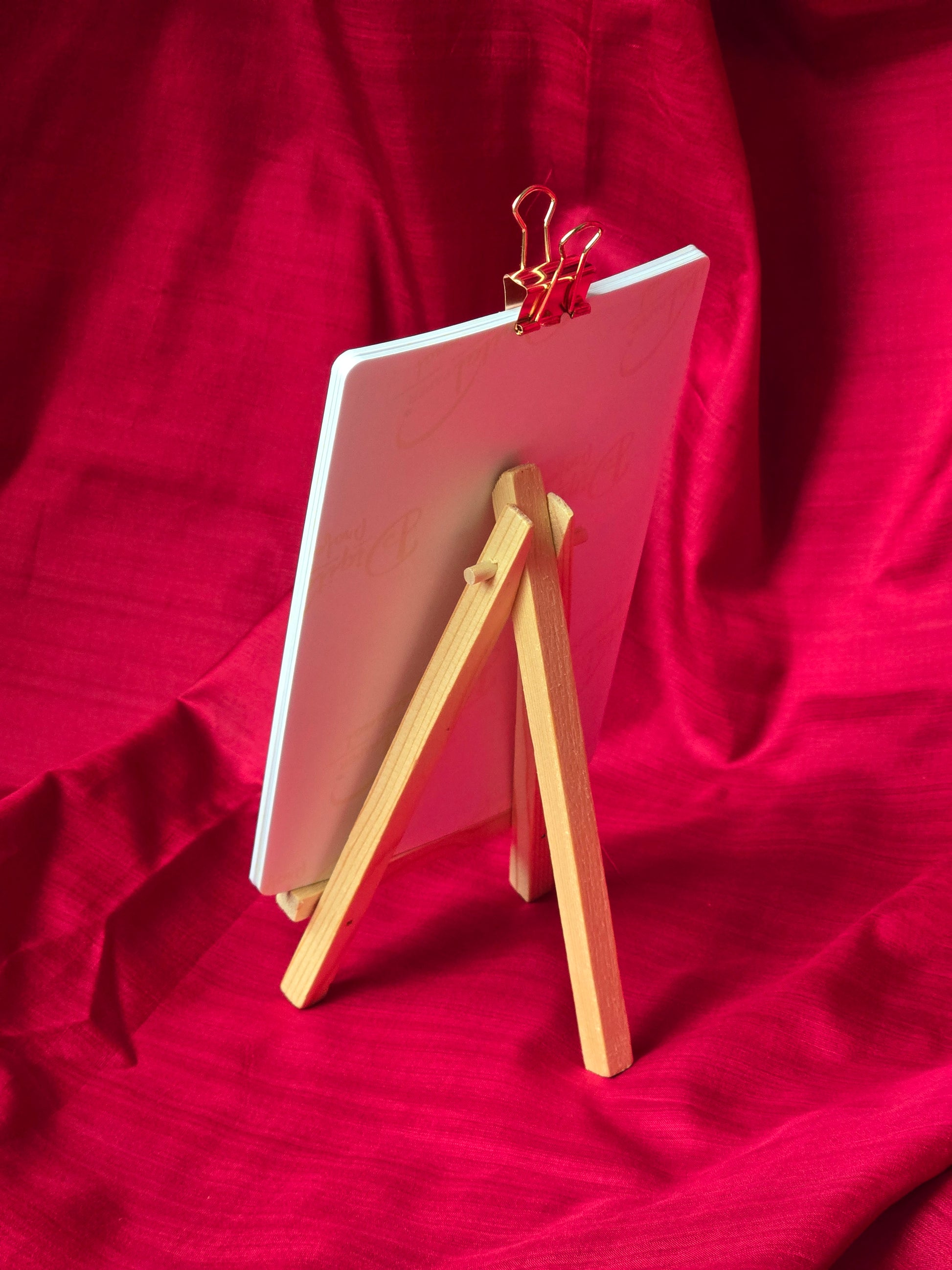 A 6 inch painting easel, twelve 6x4 inch cards, each for a month printed on luster sheets, and one rose gold 19mm binder clip for support. Shipping included!