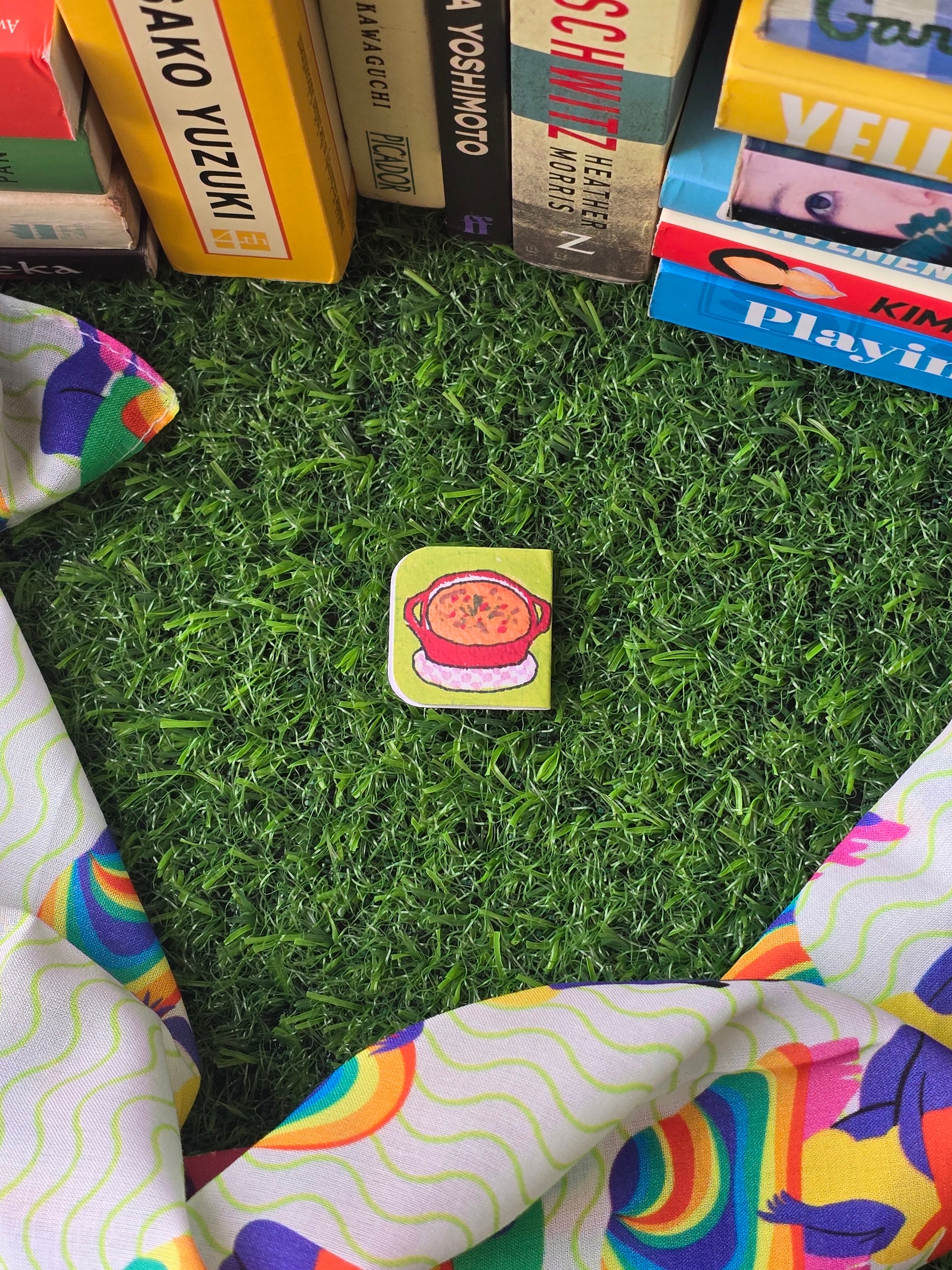 Tiny magnetic thumb tab shaped like a tasty bite. It sticks right to your page, adding a warm, delicious pause to every chapter.