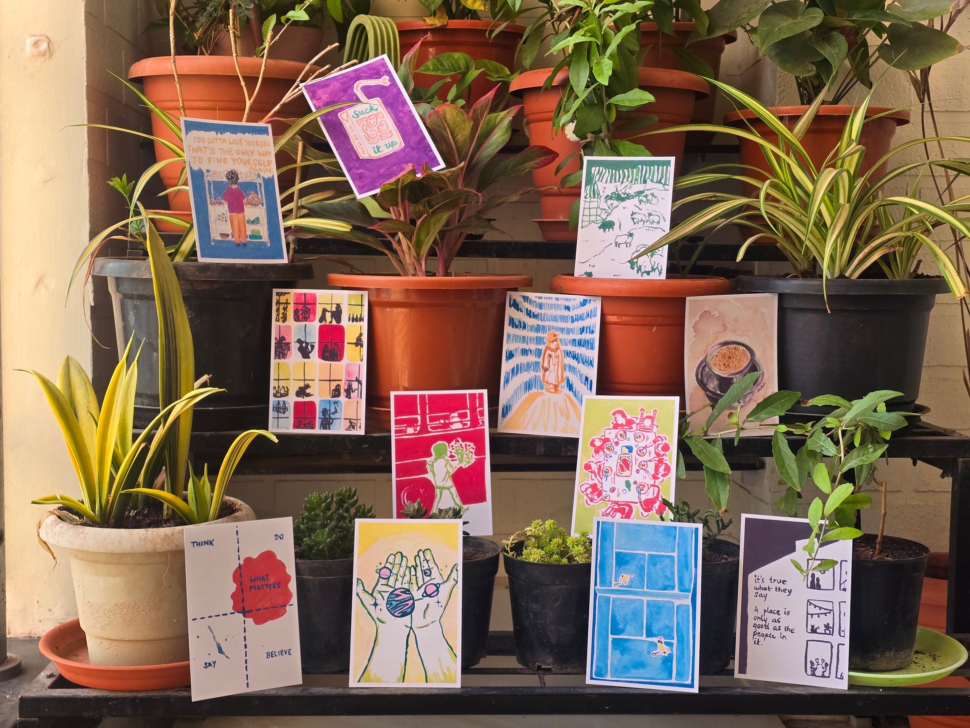 Pin them above your study table, tape them to your cupboard, prop them on the mini easel, or gift them to that one person who gets it. Mix and match to build your own mood board, or keep them together as a tiny gallery that reminds you your thoughts, doubts and daydreams are all welcome here.
