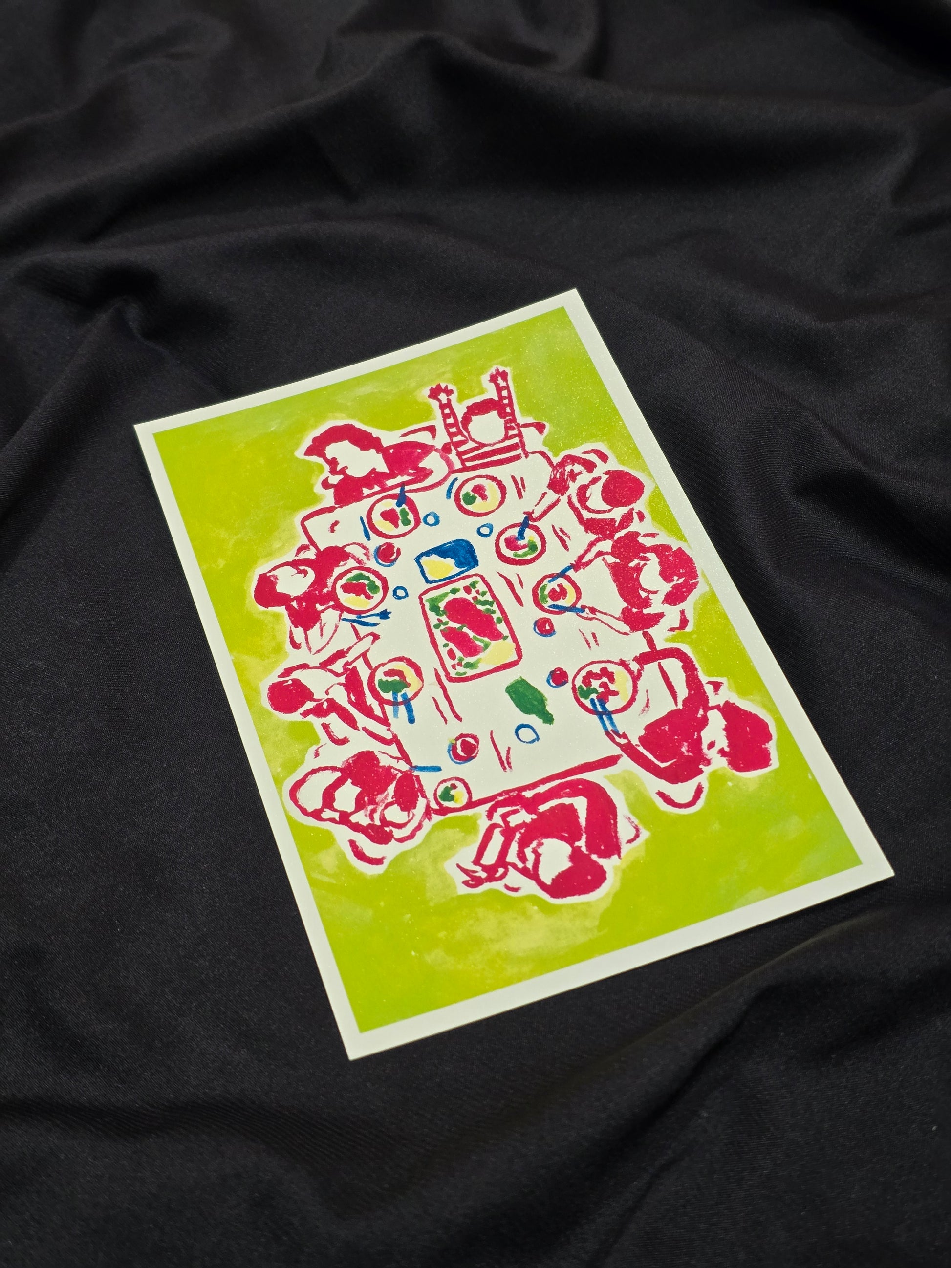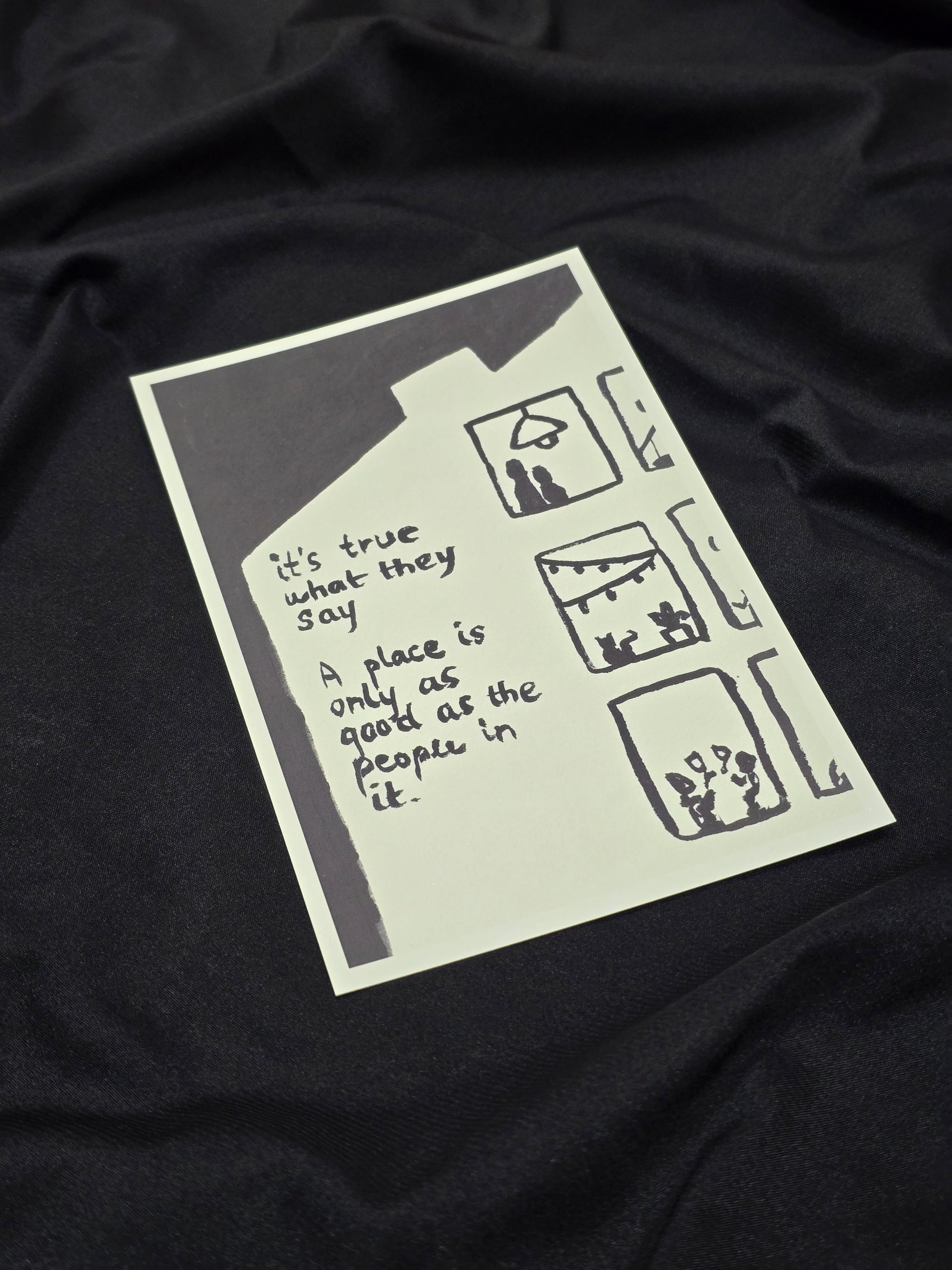 This print set collects ten hand‑painted moments: apartment windows filled with people, the entire universe in your hands, falling asleep counting sheep, quiet lines about home, being grateful for the lives we live, physical movement as something fun than masculine, being drowned by books, putting a stop to spiraling negative thoughts, a happy meal with loved ones, and a simple guiding light of what really matters. Every piece looks like it was torn out of a personal sketchbook. A little bit dreamy, a little bit honest, always human.