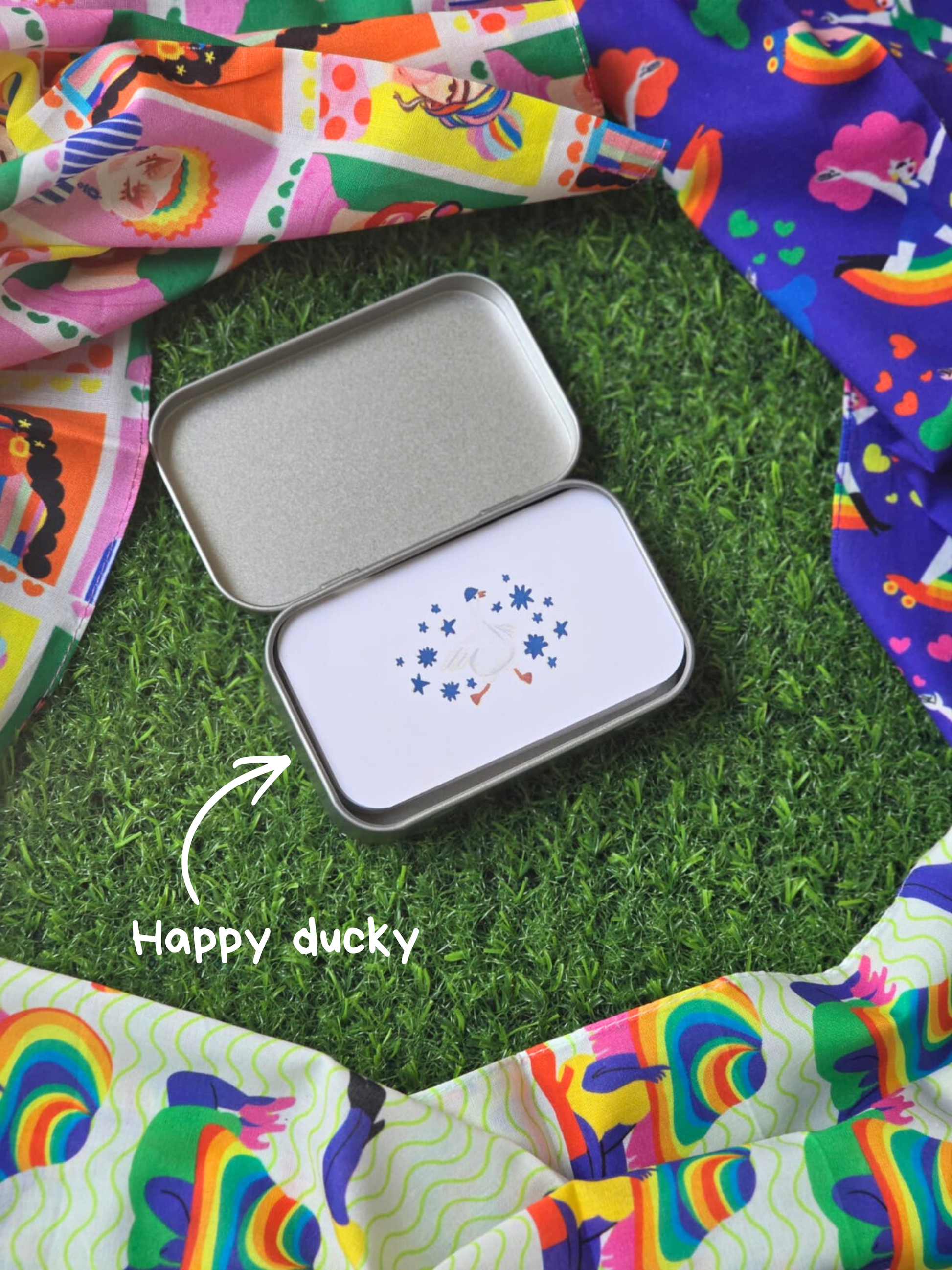 The tin box is 9.5x6cm and can fit right into your pocket :)