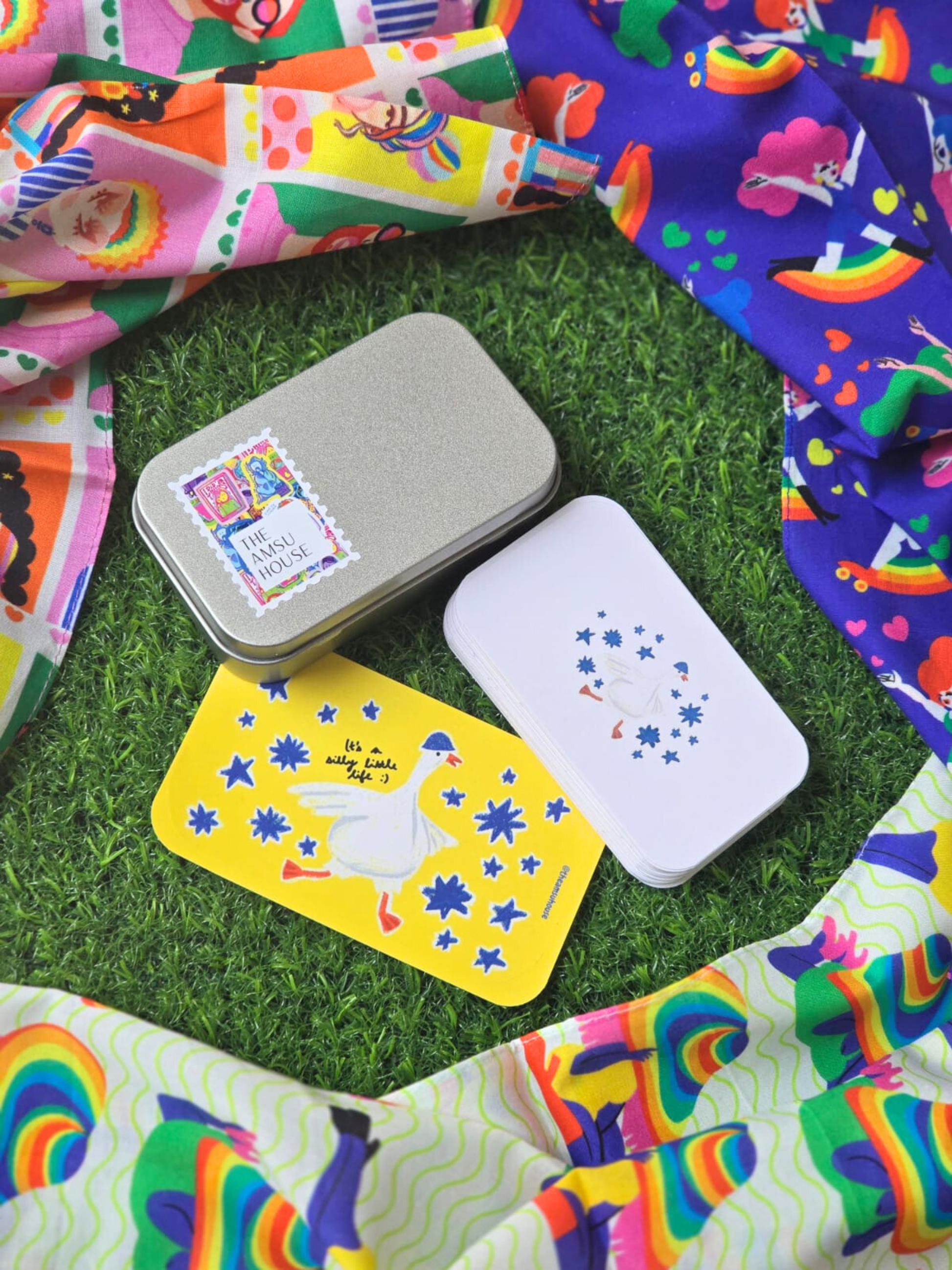 Pocket-sized tin with 40 tiny cards whispering silly truths: life's absurd, and everything's gonna be okay. For anxious moments or spirals when chatting’s not on the table, pull one out and let the gentle nudge bring back your smile, quiet and easy.