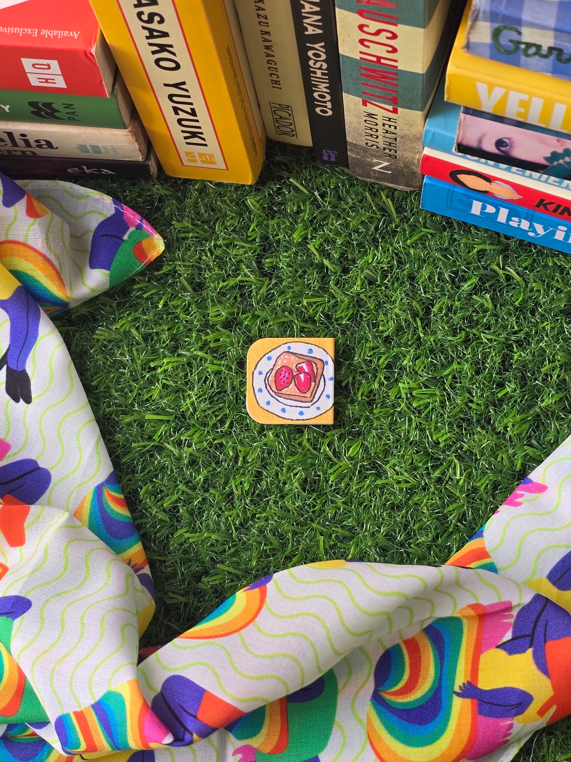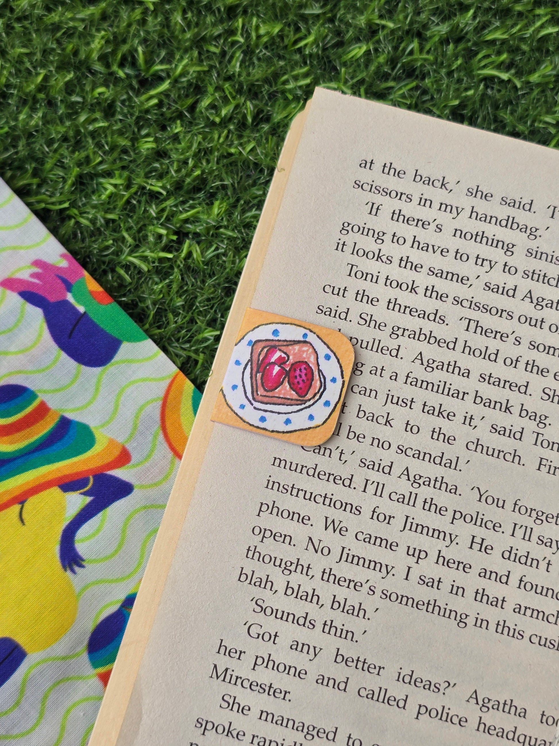 Tiny magnetic thumb tab shaped like a tasty bite. It sticks right to your page, adding a warm, delicious pause to every chapter.